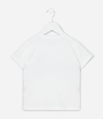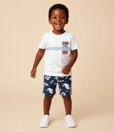 Ref: Camiseta infantil com gola redonda, mangas curtas e estampa listrada lettering "Surf day". A peça é confeccionada com boas práticas ambientais e algodão certificado bci.