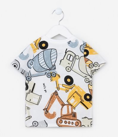 Ref: Camiseta infantil em algodão com mangas curtas, gola redonda e estampa de tratores e caminhões.