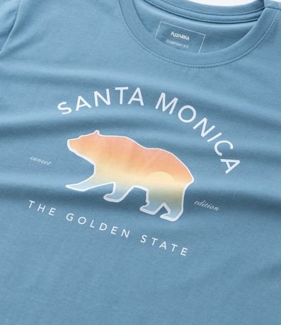 Camiseta infantil confeccionada em algodão de material e processo mais sustentáveis. Possui gola redonda, manga curta e estampa de urso com lettering "Santa Monica".