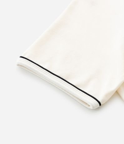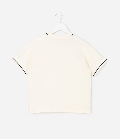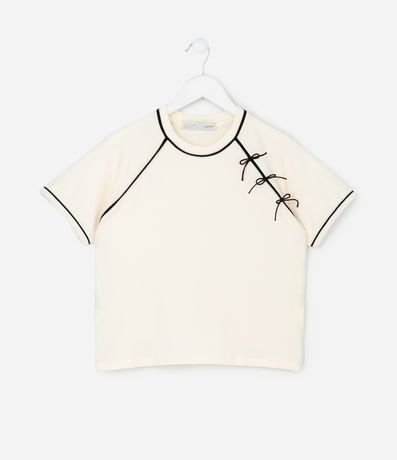 Camiseta infantil confeccionada em meia malha de algodão certificado BCI, com gola redonda e mangas curtas. Possui vivo contrastante aplicado nas costuras e três laços decorativos na parte frontal, oferecendo modelagem over e estrutura confortável para o uso diário.