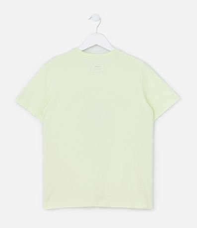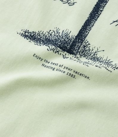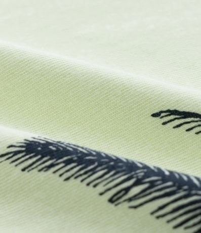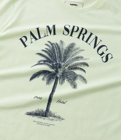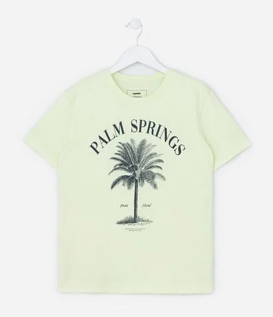 Ref: Camsieta infantil de modelinho confeccionada em algodão de material e processo mais sustentáveis. Possui gola redonda, manga curta e estampa de palmeira, com lettering "Palm Springs"
