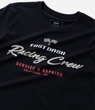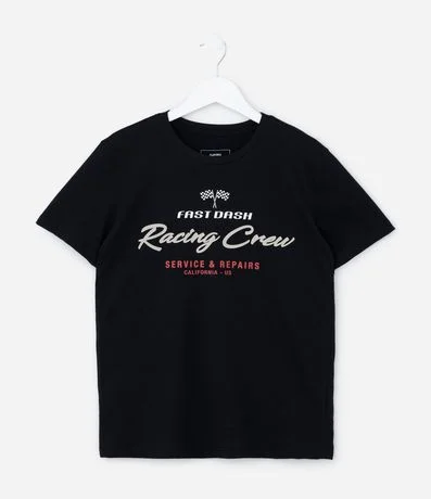 Ref: Camiseta infantil com gola redonda, mangas curtas e estampa lettering "Racing Crew". O item é confeccionado com boas práticas ambientais e algodão certificado bci.