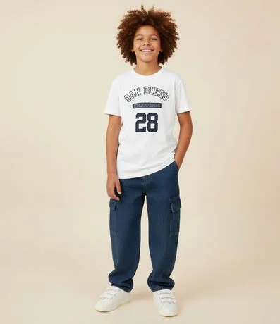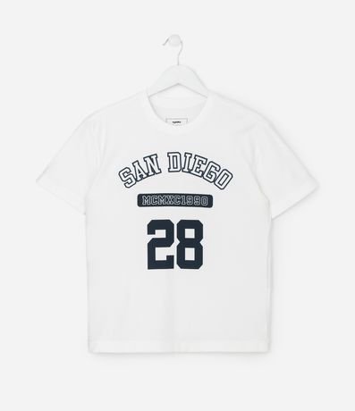 Ref: Camiseta infantil confeccionada em meia malha de algodão certificado BCI, com gola redonda e mangas curtas. Apresenta estampa localizada San Diego 28 aplicada na parte frontal com efeito texturizado, além de modelagem relaxed.