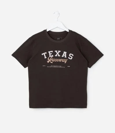 Ref: Camiseta infantil com gola redonda, mangas curtas e estampa lettering "Texas Raceway". A peça é confeccionada com boas práticas ambientais e algodão certificado bci.