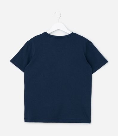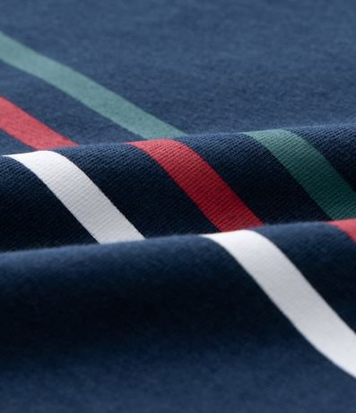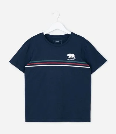 Ref: Camiseta infantil regular com gola redonda, confeccionada em algodão mais sustentável, com melhores práticas ambientais, manga curta e listras com ursinho contrastantes.