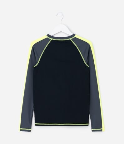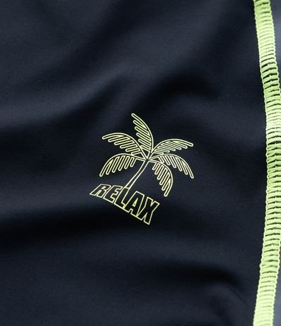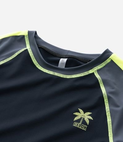 Ref: Camiseta infantil confeccionada em poliamida com proteção UV50+, gola redonda e mangas longas. Possui estampa localizada de coqueiro e acabamentos contrastantes em lima, oferecendo conforto, elasticidade e rápida secagem para dias de praia e piscina.