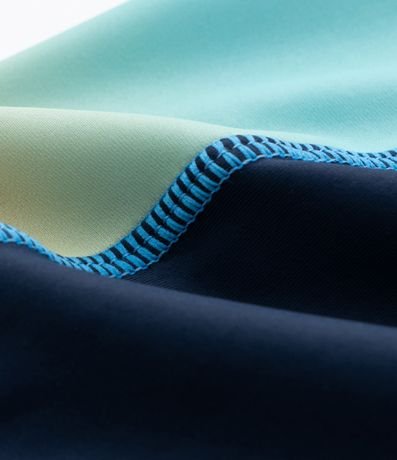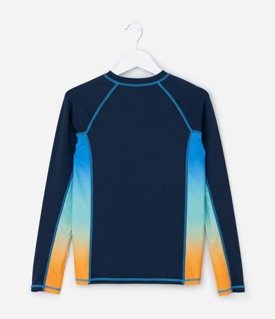 Camiseta infantil confeccionada em microfibra leve com proteção UV. Possui gola redonda, fechamento por zíper, mangas longas e estampa em degradê.