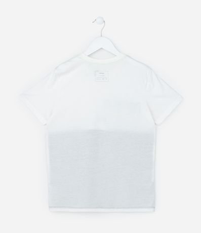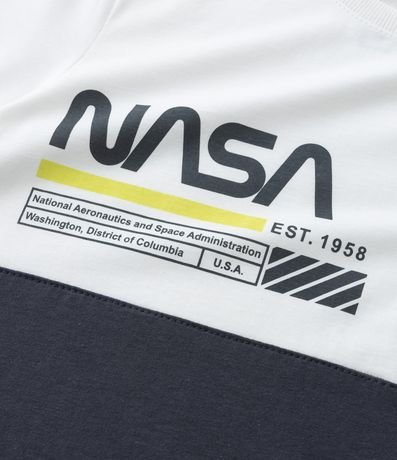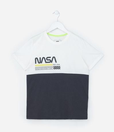Ref: Camiseta infantil, manga curta, recorte bloco de cor e estampa frontal NASA.
