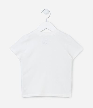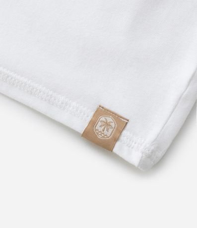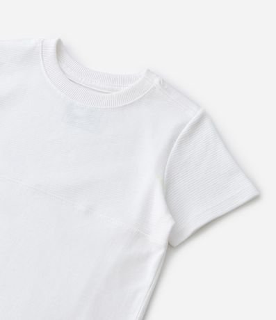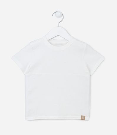Ref: Camiseta infantil, manga curta, em meia malha com recorte texturizado e etiquetinha aplicada na barra.