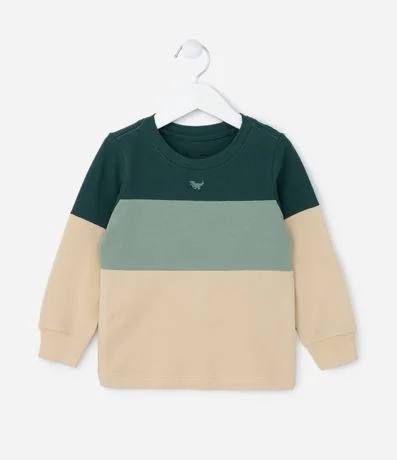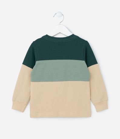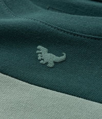 Camiseta manga longa confeccionada em piquet, com recortes e estampa de dinossauro.