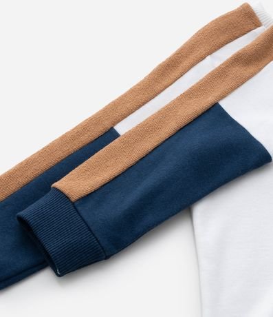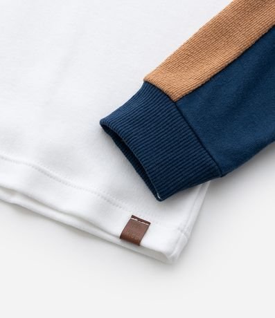 Ref: Camiseta infantil confeccionada em algodão, com gola redonda e mangas longas com recortes e etiqueta na barra.