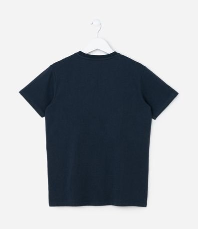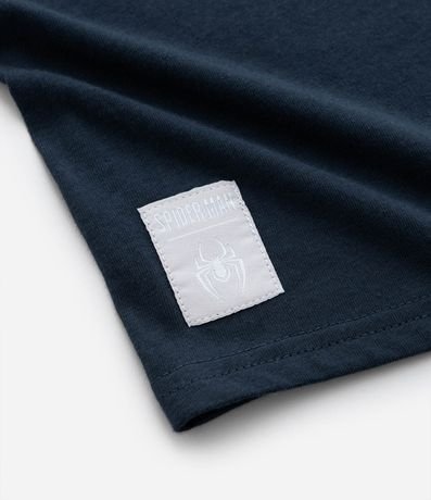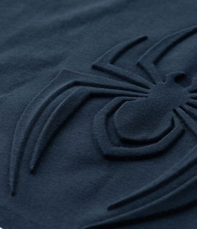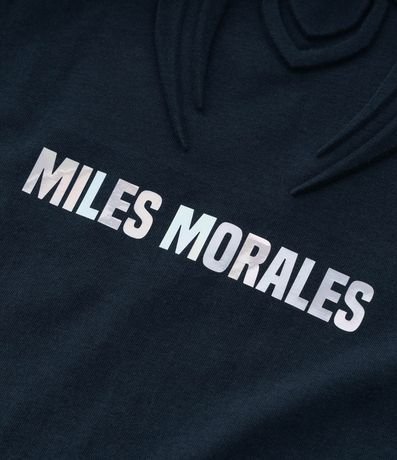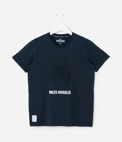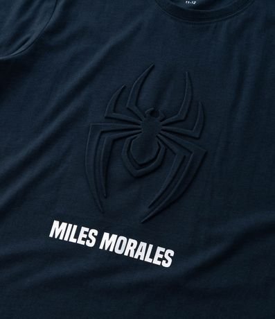 Ref: Camiseta infantil com gola redonda, mangas curtas e estampa de aranha em relevo com lettering "Miles Morales" do Homem-Aranha. A peça é confeccionada com algodão certificado bci.