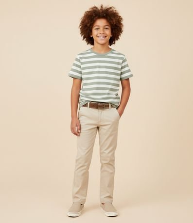 Ref: Camiseta infantil confeccionada em algodão mais sustentável através de boas práticas ambientais, no modelo comfort. Possui gola redonda, manga curta e estampa de listras.