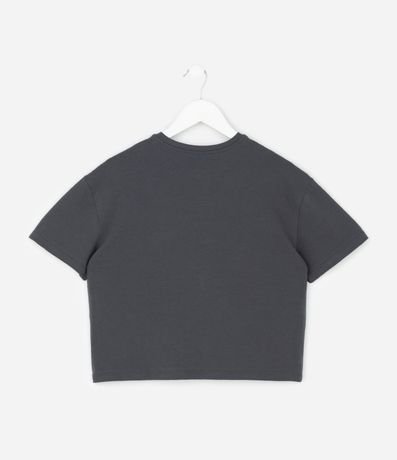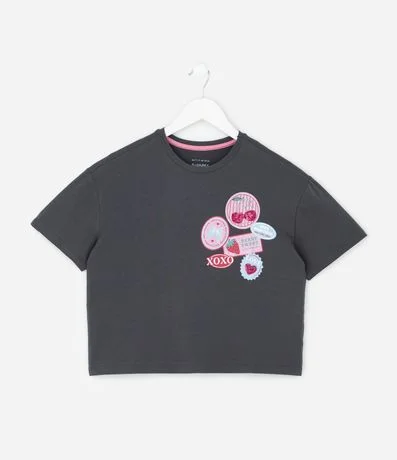 Ref: Camiseta infantil relaxed confeccionada em algodão certificado BCI e boas práticas ambientais. Possui gola redonda, manga curta e estampa localizada com selos de frutas em glitter, proporcionando toque divertido.