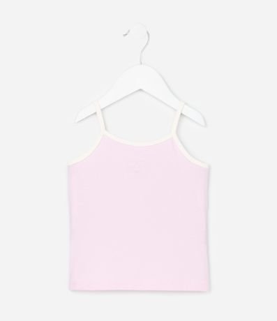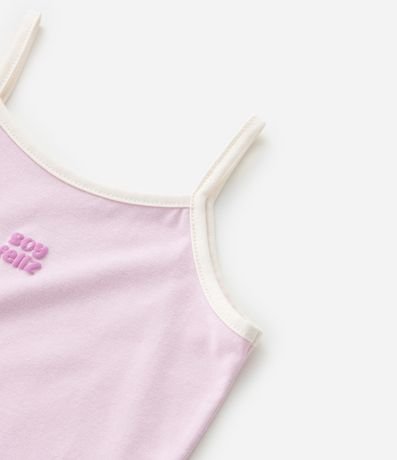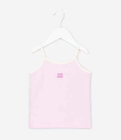 Camiseta infantil confeccionada em algodão mais sustentável.  Possui alças finas, contrastante e estampa lettering "Soy feliz".