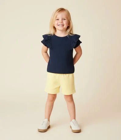 Camiseta infantil confeccionada em algodão certificado BCI e boas práticas ambientais, garantindo moda responsável. Modelo com gola redonda, mangas curtas e babados em broderie nos ombros, ideal para compor looks delicados e confortáveis para o dia a dia.