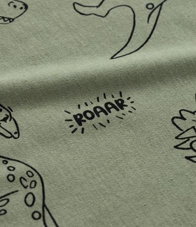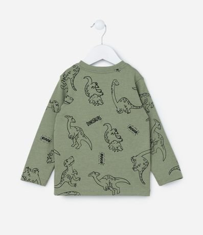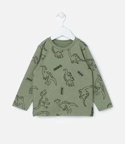 Ref: Camiseta infantil com gola redonda, mangas longas e estampa de dinossauros. A peça é confeccionada com boas práticas ambientais e tecido de pet reciclado.