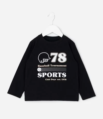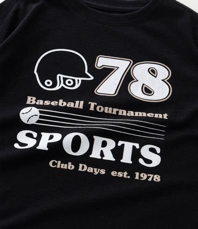 Camiseta infantil confeccionada em meia malha com PET reciclado, oferecendo toque macio e caimento confortável. Possui gola redonda, mangas longas e estampa localizada com número 78, capacete e lettering Baseball Tournament Sports, criando visual esportivo e moderno para looks casuais.