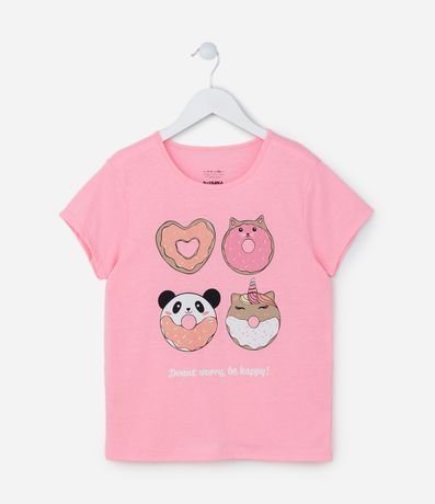 Ref: Camiseta manga curta com Estampa localizada donuts bichinhos, confeccionada em algodão, trazendo mais estilo e conforto que os pequenos amam.