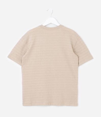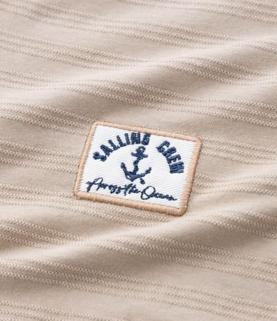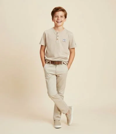 Camiseta infantil confeccionada em interlock texturizado de algodão certificado BCI, com gola henley de dois botões e mangas curtas. Possui etiqueta decorativa aplicada na parte frontal e modelagem regular que mantém boa estrutura e conforto no uso diário.