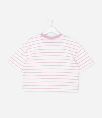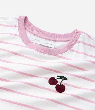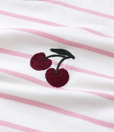 Ref: Camiseta infantil com modelo oversized, confeccionada em algodão certificado BCI. Possui gola redonda contrastante, mangas curtas e padronagem listrada, além de bordado frontal de cerejas.