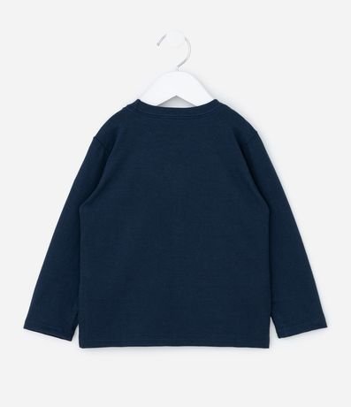 Ref: Camiseta infantil confeccionada em algodão certificado BCI e boas práticas ambientais. Possui gola redonda, mangas longas e barra tradicional. Conta com estampa localizada de listras no peito.