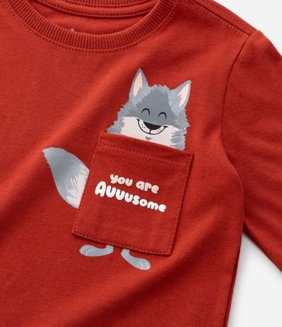 Ref: Camiseta infantil confeccionada em algodão certificado BCI e boas práticas ambientais. Possui gola redonda, mangas longas e estampa localizada de lobo com bolsinho frontal decorado. Estrutura leve em meia malha com toque macio ideal para compor looks casuais do dia a dia.