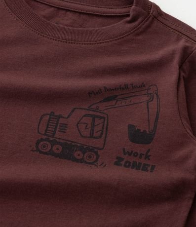 Camiseta infantil confeccionada em algodão certificado BCI e boas práticas ambientais. Possui gola redonda, mangas longas e estampa localizada de escavadeira com lettering temático. Estrutura leve em meia malha que garante toque macio e conforto ideal para o uso diário.