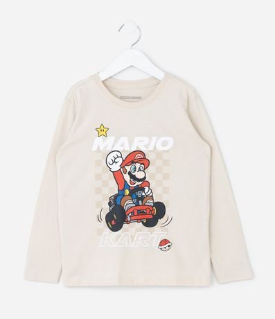 Ref: Camiseta infantil modelo regular confeccionada em algodão certificado BCI. Possui gola redonda, mangas longas e estampa localizada do universo Mario Kart com grid xadrez e ícones clássicos do jogo, criando visual divertido e moderno para compor looks casuais.