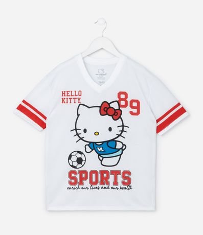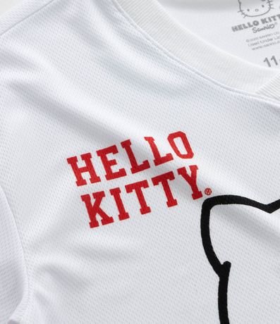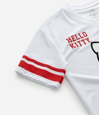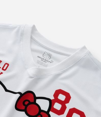 Ref: Camiseta infantil confeccionada em algodão mais sustentável através de boas práticas ambientais, no modelo oversized. Possui gola redonda, manga curta, estampa e lettering "Hello Kitty".