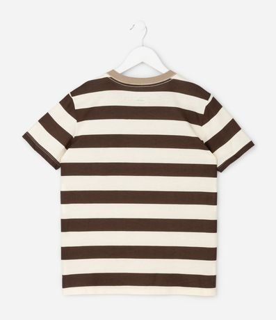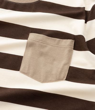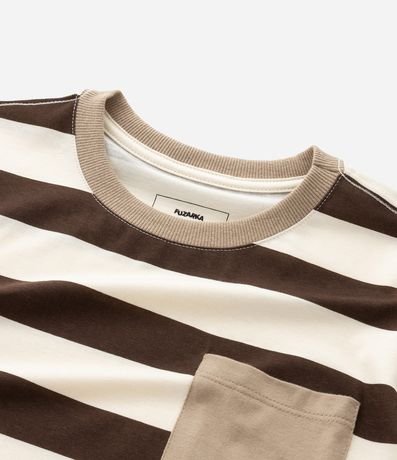 Ref: Camiseta infantil confeccionada em algodão mais sustentável através de boas práticas ambientais, no modelo regular. Possui gola redonda, manga curta, estampa de listras e bolsinho contrastante.