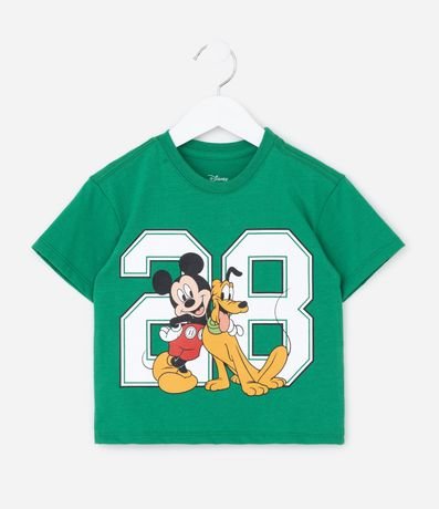 Ref: Camiseta infantil confeccionada em algodão mais sustentável através de boas práticas ambientais, no modelo relaxed. Possui gola redonda, manga curta e estampa do Mickey e Pluto.