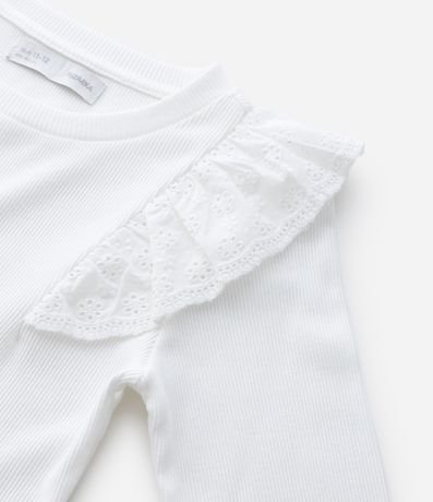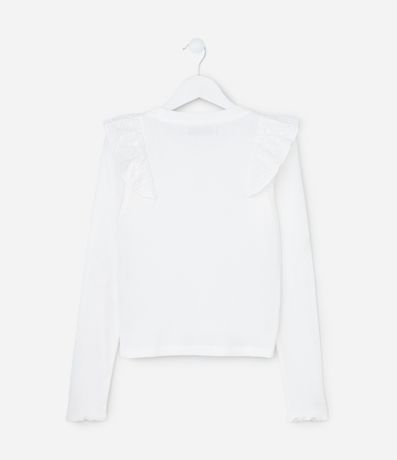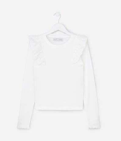 Camiseta infantil com modelagem regular, confeccionada em algodão certificado BCI e boas práticas ambientais. Possui superfície canelada, gola redonda, mangas longas e babado de broderi nos ombros, trazendo textura delicada e estilo para compor combinações confortáveis do dia a dia.