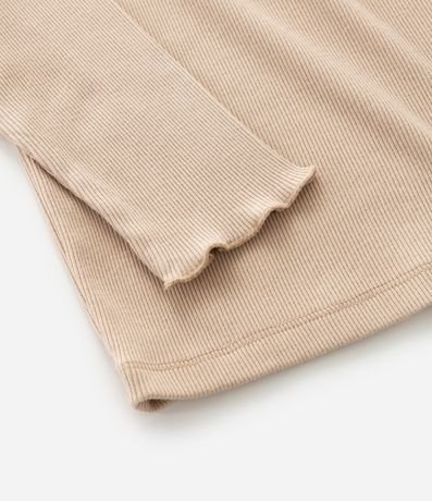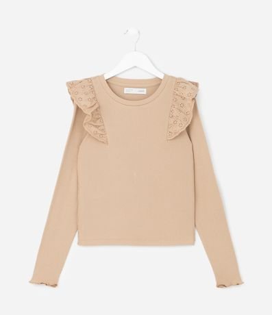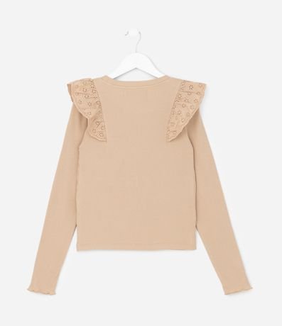 Camiseta infantil com modelagem regular, confeccionada em algodão certificado BCI e boas práticas ambientais. Possui superfície canelada, gola redonda, mangas longas e babado de broderi nos ombros, trazendo textura delicada e estilo para compor combinações confortáveis do dia a dia.