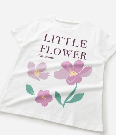 Camiseta infantil confeccionada em algodão mais sustentável através de boas práticas ambientais, no modelo slim. Possui gola redonda, manga curta, estampa de flores com glitter e lettering "Little Flower".