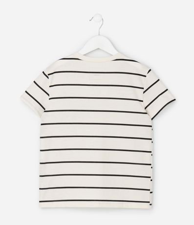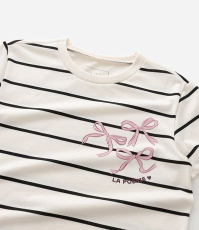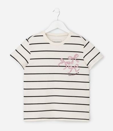 Ref: Camiseta infantil confeccionada em meia malha macia com algodão certificado BCI, trazendo modelagem slim, gola redonda e mangas curtas. Apresenta listras clássicas em toda a peça e estampa localizada de laços delicados na região do peito, garantindo visual leve, moderno e confortável para o dia a dia.