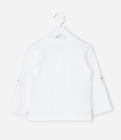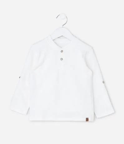 Ref: Camiseta infantil confeccionada em malha texturizada com toque macio, trazendo abertura frontal com botões e mangas longas com martingale funcional para ajuste. Possui gola redonda e acabamento confortável, ideal para composições versáteis. Confeccionada em algodão certificado BCI.