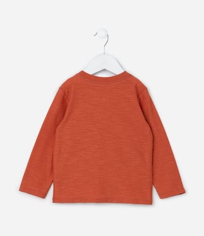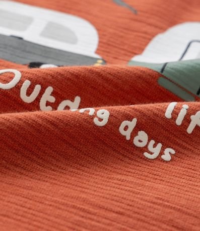 Ref: Camiseta infantil confeccionada em algodão mais sustentável, texturizada, com mangas longas e com estampa de carros e paisagem.