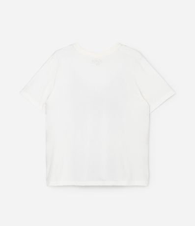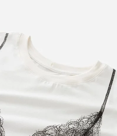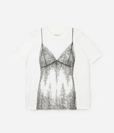 Camiseta feminina confeccionada em algodão mais sustentável. Possui uma técnica simulando sobreposição de uma camisola em renda na camiseta. A gola é redonda e mangas curtas.