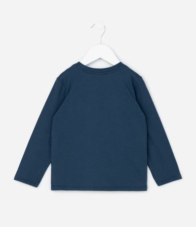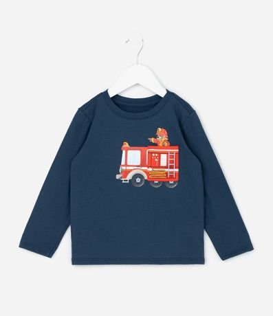 Ref: Camiseta infantil confeccionado em algodão mais sustentável através de boas práticas ambientais. Possui golas redondas, mangas longas e bolsinho que possui um carro de bombeiro com ursinho.