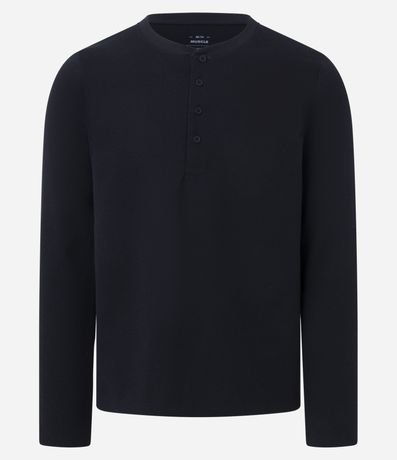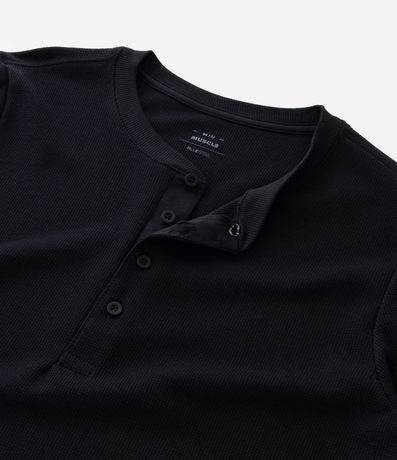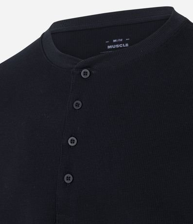 Camiseta masculina manga longa com textura waffle, detalhe de botões e modelagem muscle. Confeccionada em algodão certificado BCI e boas práticas ambientais, perfeita para um visual moderno e responsável.