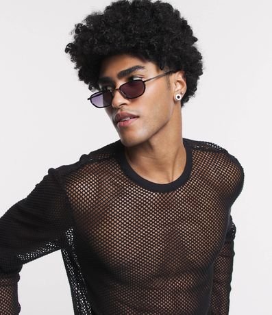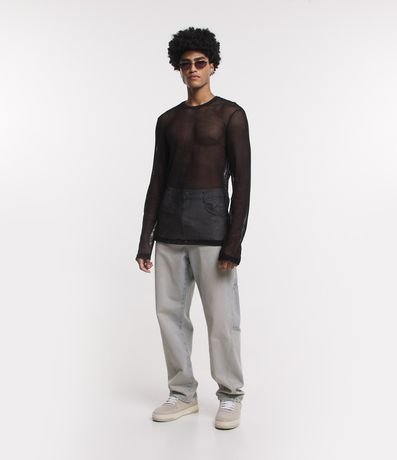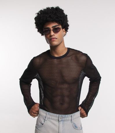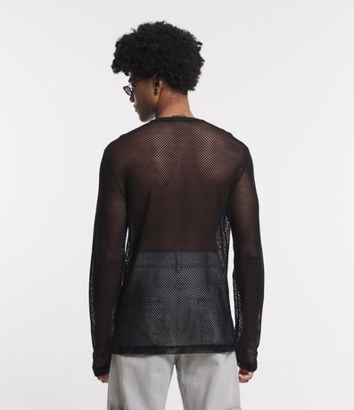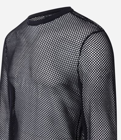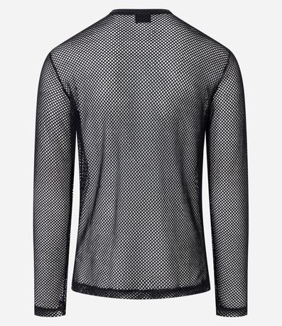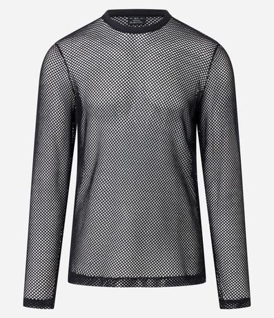 Camiseta manga longa, confeccionada em meia malha e com textura furadinha.