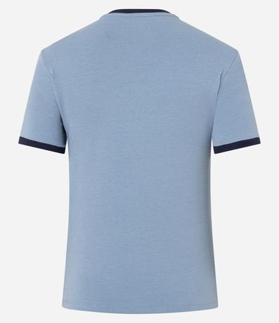 Ref: Camiseta feminina confeccionada em algodão certificado bci com viés contrastantes, gola redonda, manga curta e estampa lettering Maldives com flores.
