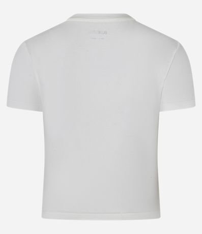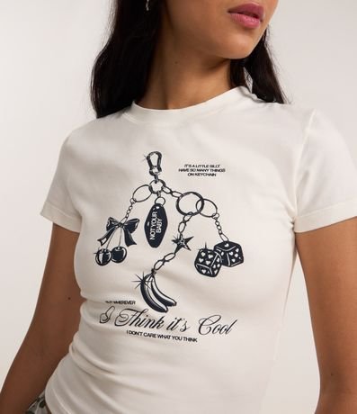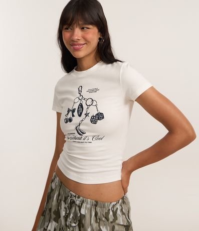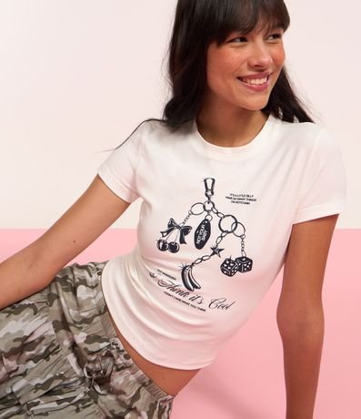 Ref: Camiseta new t-shirt (ou baby look) confeccionada em malha de algodão mais sustentável. A blusa tem gola redonda, mangas curtas e estampa frontal de chaveiro.