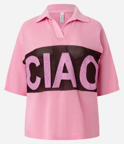 Ref: Camiseta over com manga curta, confeccionada em tricô produzido em boas práticas ambientais, faixa contrastante frontal e lettering Ciao.