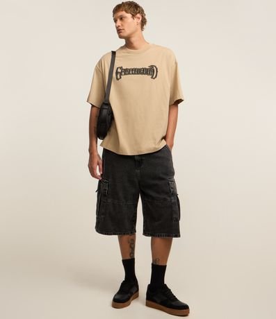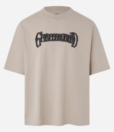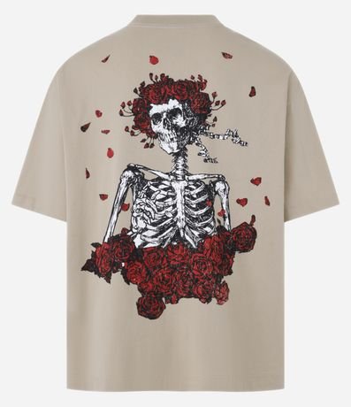 Camiseta masculina confeccionada em algodão, gola redonda, manga curta. Peça no modelo overboxy com estampa lettering greatful dead e caveira com rosas.