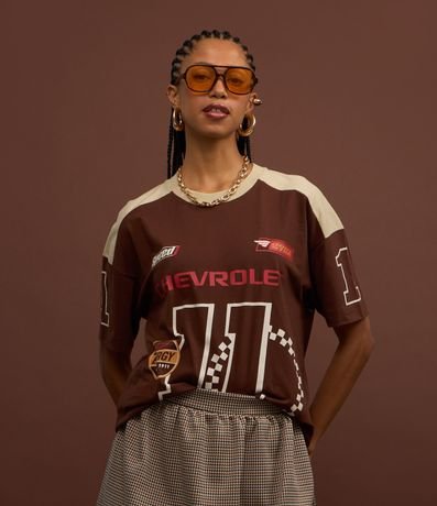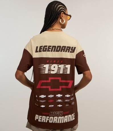 Ref: Camiseta feminina de modelo oversized, confeccionada em algodão mais sustentável, com gola redonda, mangas curtas, recorte contrastante nos ombros e costas e estampa Chevorlet.