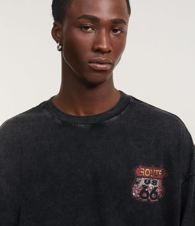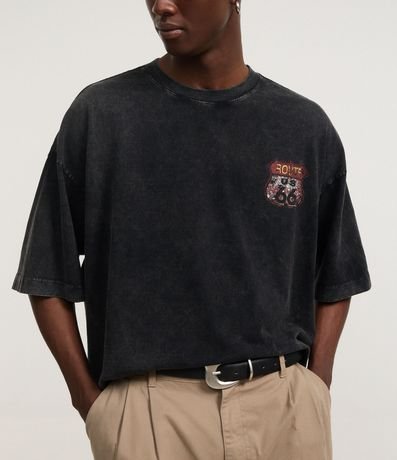 Camiseta masculina confeccionada em algodão mais sustentável através de boas práticas ambientais, no modelo oversized. Possui gola redonda, manga curta, estampa de placas e marmorizada.
