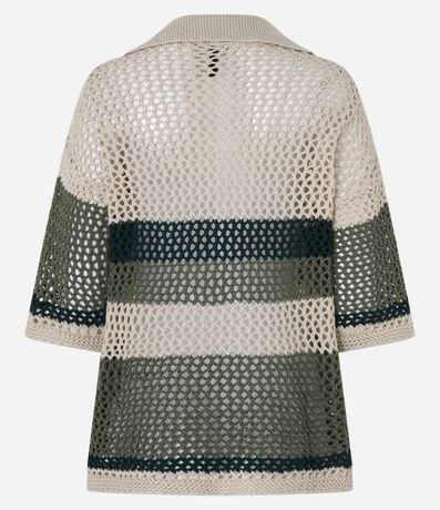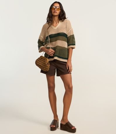 Camiseta t-shirt com gola polo, textura em furinhos, confeccionada em tricô e com listras largas. Pela no modelo oversized.