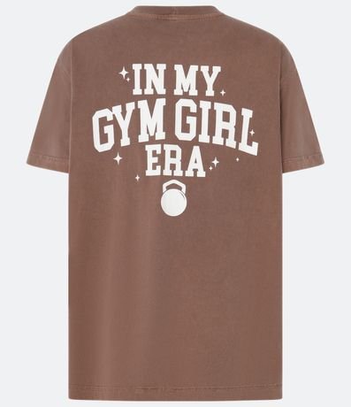 Camisetão esportivo confeccionado com algodão BCI e seguindo boias práticas ambientais. A blusa tem gola redonda, mangas curtas, efeito estonado, estampa pequena na frente e estampa grande nas costas "in my gym girl era" (na minha era de garota de academia).